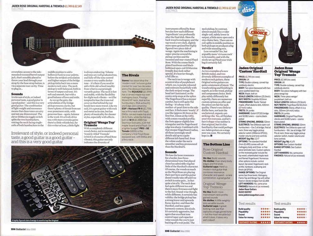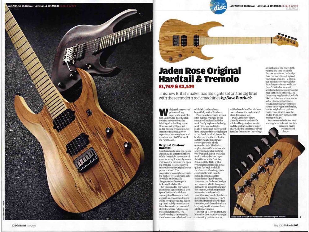Guitarist magazine issue 328 May 2010 features a review of two Jaden Rose Guitars, reviewer Dave Burrluck awards Guitarist Choice award to the Original Series hardtail in a 4 page epic.